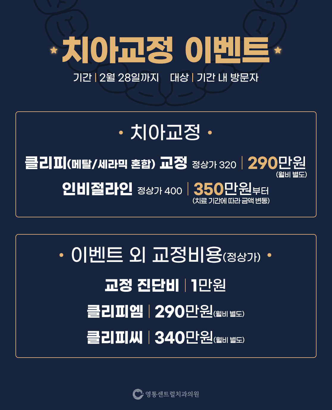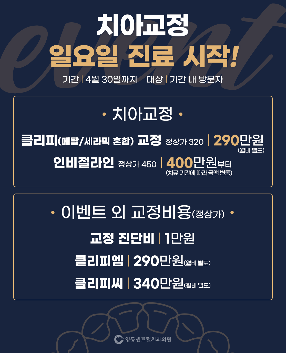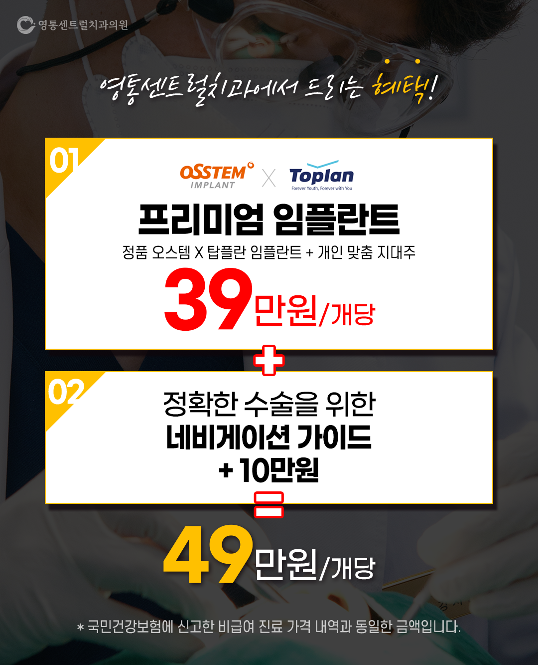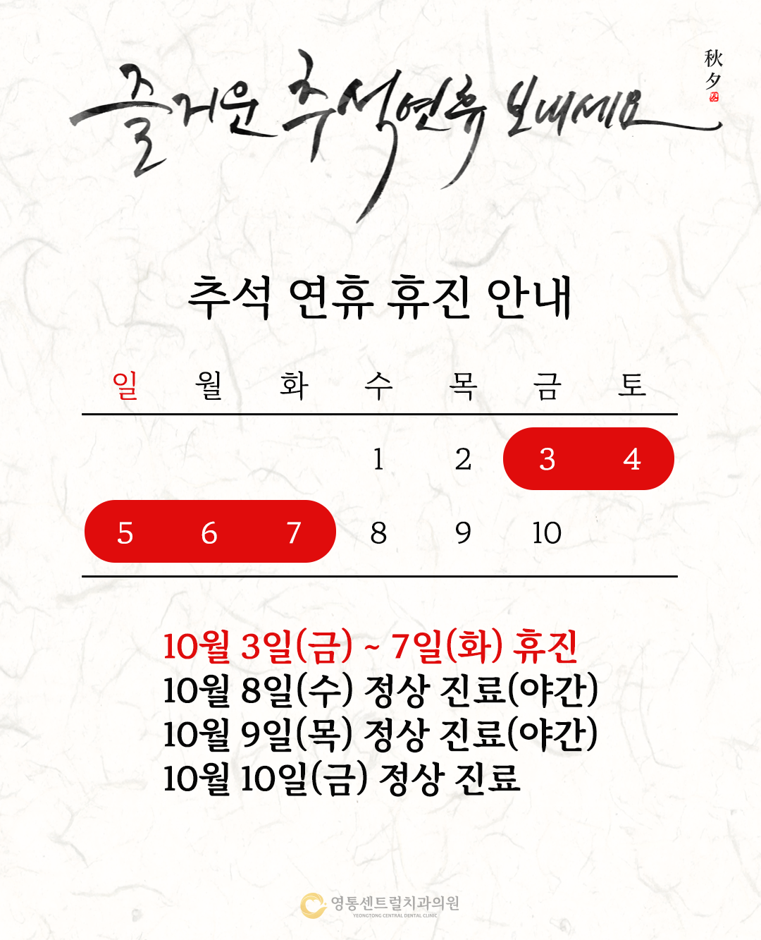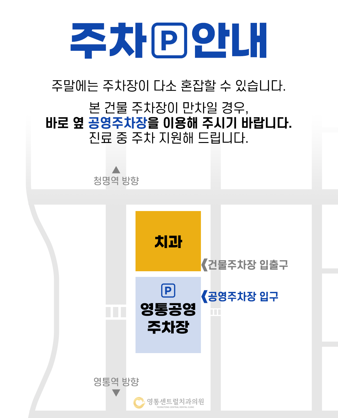 CONTACT US YEONGTONG CENTRAL DENTAL HOSPITAL 주소 경기 수원시 영통구 봉영로 1606 미네시티프라자 202호 진료시간 월/화/수/목 AM 10 : 00 ~ PM 08 : 30 금요일 AM 10 : 00 ~ PM 07 : 00 토/일 AM 09 : 00 ~ PM 02 : 00 점심시간 PM 01 : 00 ~ PM 02 : 30 ※ 토, 일, 공휴일은 점심시간 없이 진료합니다.※ 공휴일 진료는 전화문의 주세요.